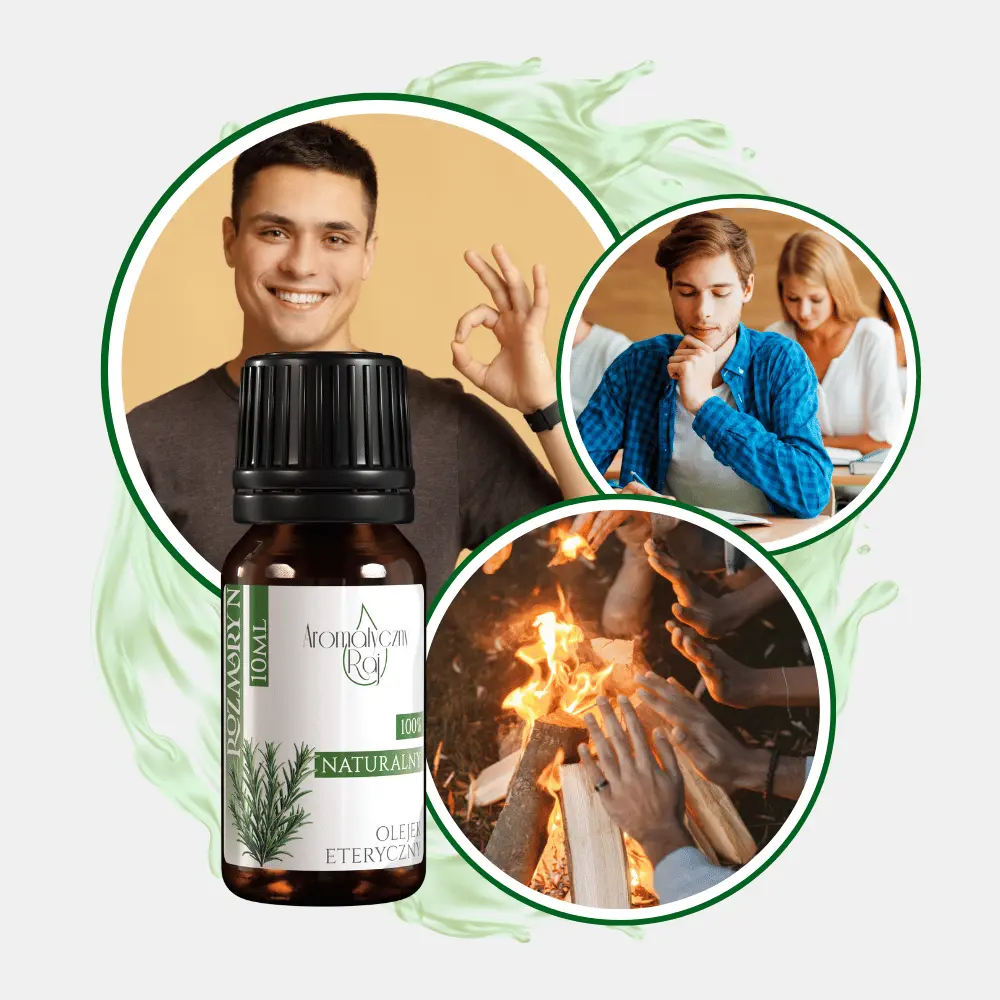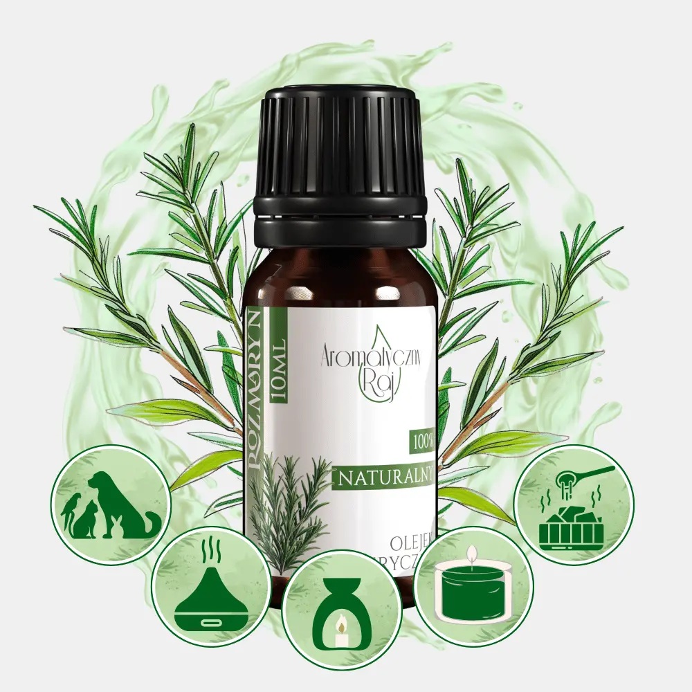 Naturalny olejek rozmarynowy jest ceniony w aromaterapii za swoje właściwości wspierające jasność umysłu, pamięć i zdolność skupienia. Idealny do stosowania podczas pracy umysłowej, nauki lub kreatywnych zadań.