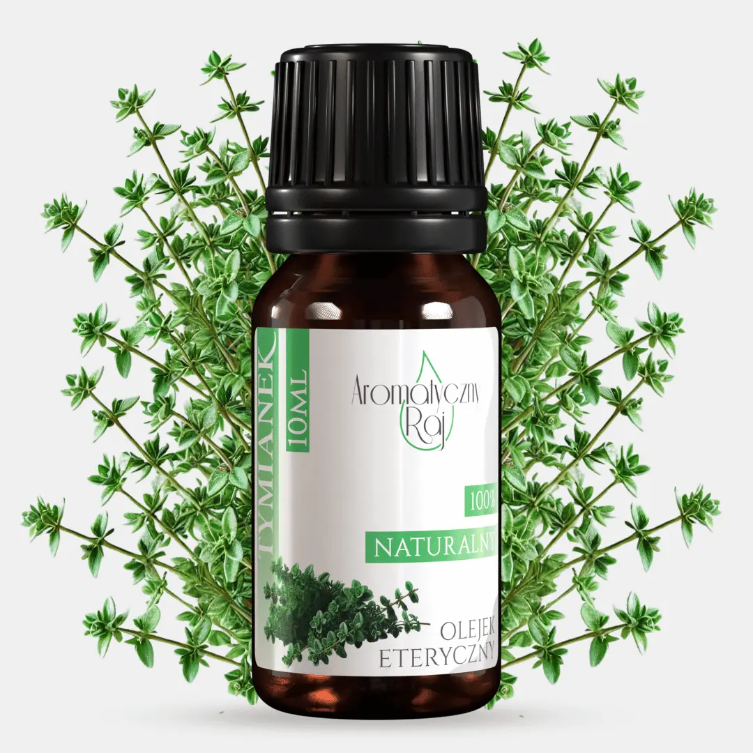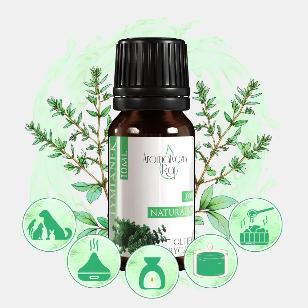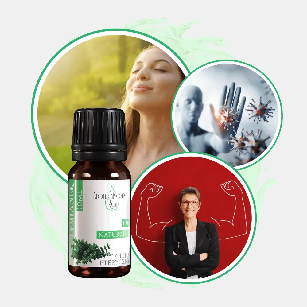 Naturalny olejek tymiankowy słynie z silnych właściwości antybakteryjnych i przeciwwirusowych. W aromaterapii wspiera organizm w ochronie przed infekcjami i pomaga utrzymać zdrowe, czyste powietrze w otoczeniu.